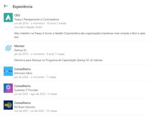 Atualizar sua página de experiência no LinkedIn, incluindo o trabalho realizado como consultor ou conselheiro para nossos clientes de serviços, fortalece sua presença e credibilidade no mercado, demonstrando expertise em suas áreas de atuação e inspirando confiança em potenciais clientes que visitam seu perfil.